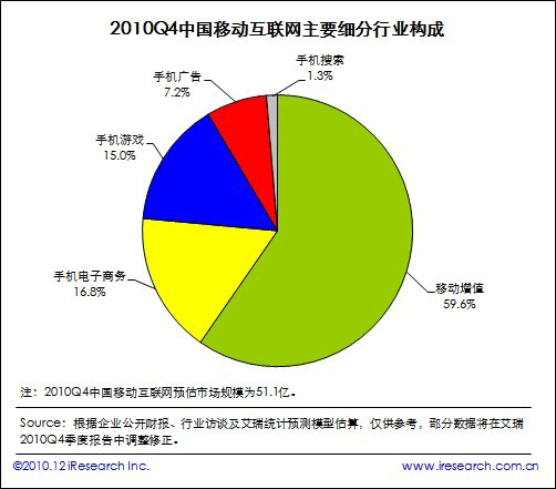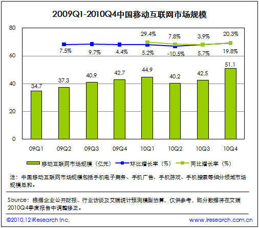 根據(jù)艾瑞咨詢即將發(fā)布的2010年第四季度中國移動互聯(lián)網(wǎng)市場監(jiān)測數(shù)據(jù)顯示,2010Q4中國移動互聯(lián)網(wǎng)市場整體規(guī)模達(dá)到51.1億,同比增長19.8%,環(huán)比增長20.3%。艾瑞咨詢分析認(rèn)為,本季度電信運營商對計費通道治理開始收尾,移動增值市場整體復(fù)蘇。同時手機(jī)電子商務(wù)、手機(jī)游戲業(yè)務(wù)領(lǐng)域取得良好市場表現(xiàn),受手機(jī)應(yīng)用商店、位置簽到服務(wù)等新型手機(jī)業(yè)務(wù)創(chuàng)新的帶動,移動互聯(lián)網(wǎng)規(guī)?傮w攀升,投融資比重增加。