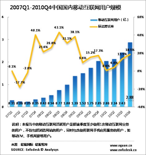 據(jù)Enfodesk易觀智庫(kù)最新發(fā)布的數(shù)據(jù)顯示,2010年第4季度中國(guó)國(guó)內(nèi)移動(dòng)互聯(lián)網(wǎng)用戶規(guī)模達(dá)2.88億人,環(huán)比增長(zhǎng)18.52%,相比去年同期呈現(xiàn)41.48%的增長(zhǎng)速度。