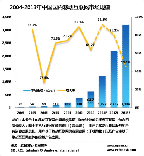 2010年中國(guó)國(guó)內(nèi)移動(dòng)互聯(lián)網(wǎng)市場(chǎng)規(guī)模達(dá)到637億元,較2009年上漲64.2%,增速放緩。除去流量費(fèi)之外,移動(dòng)互聯(lián)網(wǎng)服務(wù)收入達(dá)到342億元。