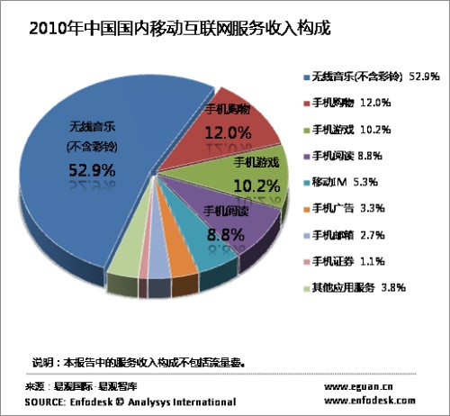 從收入構(gòu)成看來,無線音樂、手機(jī)游戲、手機(jī)閱讀逐漸成為三大主要移動(dòng)互聯(lián)網(wǎng)娛樂應(yīng)用,手機(jī)購(gòu)物增速明顯。