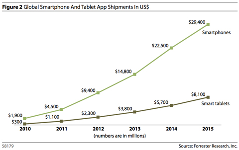 Forrester平板電腦分析師莎拉·羅特曼·埃普斯(Sarah Rotman Epps)發(fā)表博客文章稱,未來數(shù)年,平板電腦在移動(dòng)應(yīng)用市場(chǎng)上將占有相當(dāng)高的比例,到2015年,平板電腦移動(dòng)應(yīng)用市場(chǎng)規(guī)模將達(dá)到81億美元。2010年,平板電腦移動(dòng)應(yīng)用業(yè)務(wù)營收為3億美元。