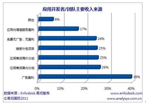 易觀國際(Analysys International)分析認(rèn)為應(yīng)用開發(fā)者難以獲取盈利分成的主要原因在于用戶對應(yīng)用本身沒有付費(fèi)下載習(xí)慣,應(yīng)用商店缺少對應(yīng)用的推廣,但應(yīng)用開發(fā)者難以盈利也和移動應(yīng)用同質(zhì)化嚴(yán)重,難以被用戶認(rèn)可本身強(qiáng)相關(guān)。