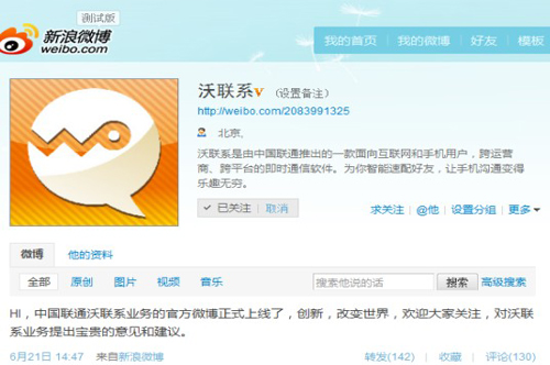 昨日下午,中國聯(lián)通“沃聯(lián)系”業(yè)務(wù)官方微博正式上線,而在稍后晚間,中國聯(lián)通官方微博也對此微博進(jìn)行推介,并稱“中國聯(lián)通即將推出一款面向互聯(lián)網(wǎng)和手機(jī)用戶,跨運(yùn)營商、跨平臺的即時(shí)通信軟件‘沃聯(lián)系’。為幫助用戶朋友更好了解和使用這款即將上線的產(chǎn)品,中國聯(lián)通沃聯(lián)系產(chǎn)品組現(xiàn)已開通@沃聯(lián)系新浪官方微博,敬請關(guān)注。”