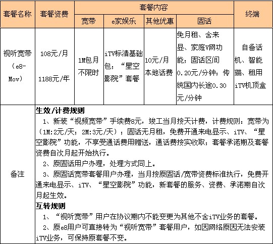 尊享e8套餐適用于對家庭上網(wǎng)時長及速度要求很高,固話使用量較大,有iTV需求的家庭客戶,分為168/月和208元/月兩檔。