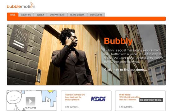 “Bubble Motion”的Bubbly平臺(tái)是一個(gè)手機(jī)端的語(yǔ)音微博服務(wù),允許用戶通過(guò)聲音向他們的關(guān)注者和粉絲發(fā)布狀態(tài)信息,模式與Twitter一樣,只是將文字變成了聲音,微博變成了bubbles,用戶將錄制的聲音更新到手機(jī),然后所有粉絲將收到一條短信通知,點(diǎn)擊短信內(nèi)的鏈接就可以收聽(tīng)。