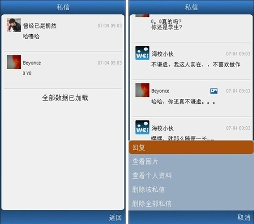 武俠小說中每每寫到傳音時(shí),都愛這樣寫“不世高人傳音入密……”。這不世高人的稱號(hào)可是讓人夢(mèng)寐以求啊。語音微博1.6 for Symbian最新加入的私信功能助你一償夙愿。每每查看其他用戶以及他的語音微博時(shí),你都可以看到私信按鈕,點(diǎn)擊即可發(fā)送私信。傳音入密就是這樣簡單。當(dāng)然,除了語音,你也可以傳送文字,很貼心有木有。