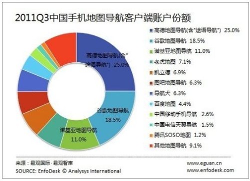 谷歌:以18.5%的綜合份額占據(jù)中國(guó)手機(jī)地圖導(dǎo)航客戶(hù)端市場(chǎng)排名次席。其中,谷歌地圖仍舊以27%的份額占據(jù)手機(jī)地圖客戶(hù)端市場(chǎng)第一的位置,但因?yàn)槠浣?jīng)營(yíng)策略和中國(guó)國(guó)內(nèi)政策等原因,谷歌地圖在內(nèi)地行貨版安卓手機(jī)中普遍被閹割,在一定程度上影響了谷歌地圖市場(chǎng)占有率的進(jìn)? 徊教嶸。链撯,业娇N氈樵げ餛還雜惺只贗疾方魑筆旨隊(duì)τ迷趇Phone5中推出,這有可能撼動(dòng)谷歌地圖在IOS平臺(tái)的統(tǒng)治地位。