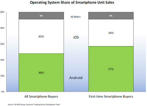 Android和iPhone一共占據(jù)了第四季度智能手機(jī)銷售總量的90%。Android在四季度依舊保持了48%的智能手機(jī)市場份額,同時(shí)Android設(shè)備在首次購買智能手機(jī)的消費(fèi)者群中表現(xiàn)更好。根據(jù)NPD每月提供的Smartphone Track服務(wù)的最新數(shù)據(jù),所有在第四季度初次購買智能手機(jī)的消費(fèi)者中,其中57%的消費(fèi)者選擇了Android設(shè)備,而相比較下只有34%的消費(fèi)者選擇了iPhone。