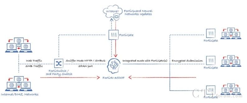此外,AI技術(shù)還貫穿于Fortinet的多個產(chǎn)品與功能中,形成高效的工作流。以威脅檢測與響應為例,當FortiGate的雙引擎也無法確定某個文件的合法性時,它可以將該文件提交給FortiNDR進行深度分析,利用云端深度神經(jīng)網(wǎng)絡(luò)AI進行0 Day攻擊、勒索軟件等深層次分析。若仍無法確定,還可進一步提交給FortiSandbox,在虛擬機環(huán)境中進行模擬操作,進行更為深入的檢測。在這一系列流程與技術(shù)的支持下,F(xiàn)ortinet的威脅檢測與響應能力已達到業(yè)界頂尖水平,向滿分100分邁進。