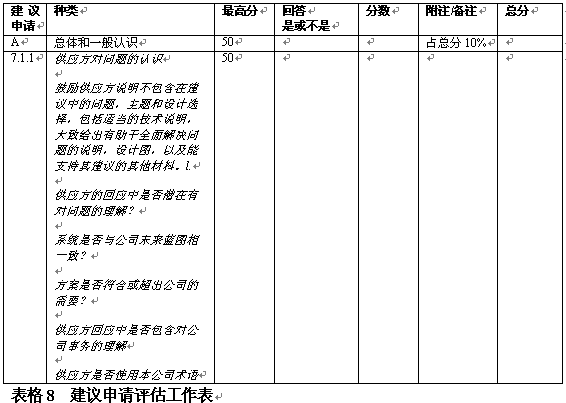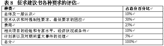 。。在決定了初步要求之后,評(píng)估小組應(yīng)具體地開(kāi)展評(píng)估工作。具體評(píng)估的目標(biāo)是通過(guò)給建議書(shū)主要方面打分作出評(píng)估。可以在算出建議書(shū)各方面占總分?jǐn)?shù)的百分比,如表8中對(duì)各方面的總覽。一般在建議書(shū)內(nèi)向提供者給出這一信息。