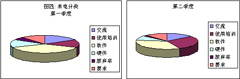為什么單位設(shè)備來(lái)電會(huì)增加呢?如果把來(lái)電的原因(圖四)分為以下幾類:軟件、硬件、溝通、使用訓(xùn)練、要求、放棄,我們可能會(huì)注意到在其他項(xiàng)略有減少的同時(shí),使用訓(xùn)練從開始時(shí)的15%躍到第二季度的30%。當(dāng)然,和其他部門合作,這一問(wèn)題是可以采取各種方式加以解決的。