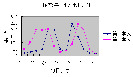 圖五中我們可以看到平均每小時(shí)來(lái)電量。比較前一季度與后一季度,我們可以看到每天中來(lái)電分布的形態(tài)有很大變化。根據(jù)來(lái)電的變化來(lái)合理安排座席代表班次,才能保證服務(wù)質(zhì)量不受影響。圖四中客戶放棄率的下降可以部分地說(shuō)明排班調(diào)整的有效性。
