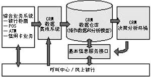 銀行CRM系統(tǒng)一般由業(yè)務(wù)處理、客戶(hù)聯(lián)系和客戶(hù)關(guān)系分析中心三部分組成。業(yè)務(wù)處理部分指銀行的綜合業(yè)務(wù)處理系統(tǒng),包括柜面業(yè)務(wù)系統(tǒng)、信用卡系統(tǒng)、POS機(jī)和ATM機(jī)等;客戶(hù)聯(lián)系部分由呼叫中心和網(wǎng)上銀行組成;客戶(hù)關(guān)系分析中心則以CRM中心數(shù)據(jù)倉(cāng)庫(kù)為核心,通過(guò)數(shù)據(jù)集成系統(tǒng)與業(yè)務(wù)處理部分連接,同時(shí)為銀行的管理層和業(yè)務(wù)分析人員提供客戶(hù)分析系統(tǒng)。