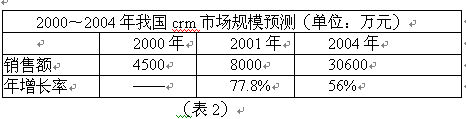 國內(nèi)CRM市場經(jīng)過一段時間的快速增長,2000年銷售額達到4500萬元左右。2001年市場情況將更好,預(yù)計銷售額將是上年的兩倍左右。CCID根據(jù)大量調(diào)查分析,對我國CRM市場規(guī)模作出如下預(yù)測: