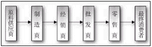 在社會化大生產(chǎn)的前提下,任何商品被制造和被消費的過程,實際上是在多個環(huán)節(jié)、多個商家進行“傳遞”的過程,這一過程構(gòu)成的“通道”就是“供應(yīng)鏈”。供應(yīng)鏈的研究就是從分銷模式開始的。在分銷模式下,最常見的價值傳遞的通道如下圖所示: