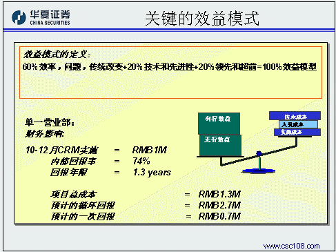華夏證券經(jīng)紀(jì)業(yè)務(wù)總部的姚磊作為唯一的成功應(yīng)用案例代表,主要是和與會(huì)的金融機(jī)構(gòu)分享在客戶關(guān)系管理規(guī)劃方面的一些成功經(jīng)驗(yàn)。華夏證券認(rèn)為,對(duì)于證券公司的經(jīng)紀(jì)業(yè)務(wù)來(lái)講,客戶關(guān)系管理的主要目標(biāo)應(yīng)該是把客戶關(guān)系管理系統(tǒng)的核心功能融入開(kāi)戶、交易、服務(wù)、咨詢等四個(gè)與客戶互動(dòng)的過(guò)程之中,比如:客戶資料規(guī)戶整合形成統(tǒng)一的客戶號(hào),管理客戶交易偏好和產(chǎn)品偏好上的變化,配合多種渠道建立一對(duì)一銷(xiāo)售流程,客戶終身價(jià)值管理。在風(fēng)險(xiǎn)控制方面,華夏證券同樣貢獻(xiàn)了寶貴的經(jīng)驗(yàn),在這方面他們認(rèn)為最重要的方面是要做好高層領(lǐng)導(dǎo)的灌輸和培訓(xùn)工作,讓企業(yè)的高層領(lǐng)導(dǎo)對(duì)于客戶關(guān)系管理有一個(gè)正確的理解,從而對(duì)于項(xiàng)目的投資有一個(gè)合理的預(yù)期和實(shí)證,通俗一點(diǎn)說(shuō),就是首先為整個(gè)項(xiàng)目找一個(gè)合適的發(fā)起人。第二點(diǎn)要注意,要有專(zhuān)業(yè)的項(xiàng)目管理隊(duì)伍,這其實(shí)就是集成商選擇方面的風(fēng)險(xiǎn)。除此之外,還要對(duì)項(xiàng)目要有一個(gè)明確的定義,關(guān)注每一步提交的結(jié)果,在項(xiàng)目過(guò)程中就隨時(shí)發(fā)現(xiàn)問(wèn)題、解決問(wèn)題。