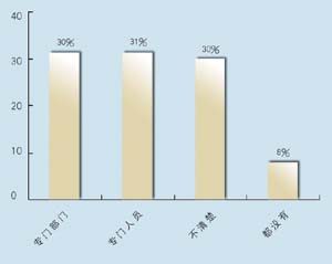 在問到實施周期上,有9家表示希望在3個月內(nèi)完成,占到47.4%,有6家接受3~6個月的周期,超過6個月的周期已經(jīng)顯得太長。在問到CRM的實施效果上,有9家認(rèn)為對公司運營效率有很大提高,8家認(rèn)為作用一般,只有2家認(rèn)為沒有作用。表明基本上企業(yè)認(rèn)可CRM的作用。在問到是否有專門人員負(fù)責(zé)CRM時,有6家表示有專門部門,有6家有專門人員,合計占62%,說明企業(yè)非常重視CRM的應(yīng)用。