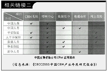 據(jù)某IT媒體2002年末的調研,只有不到1/5的中國保險公司擁有客戶關系管理系統(tǒng),但是近六成的保險公司計劃在近期內實施CRM;另一份調查則顯示中國保險業(yè)過去3年的IT投入平均達到9.36億元,幾乎所有的保險公司都在從不同側面開展CRM建設。CRM在中國保險業(yè)的應用,到底是處于落伍還是冒進狀態(tài),成為一個意味深長的話題。