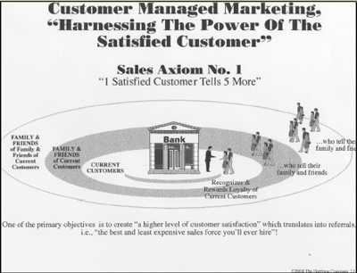 客戶滿意的影響范圍如下圖所示,客戶滿意的力量從里向外逐層波及,以現(xiàn)有客戶的滿意為基礎(chǔ),然后通過推薦傳遞到新的客戶。其傳遞路徑為“現(xiàn)有客戶”——“現(xiàn)有客戶的家人及朋友”——“現(xiàn)有客戶的家人及朋友的家人及朋友”…一直延伸下去最終使企業(yè)的營銷策略大獲成功,這一切的動力都來自于“更高的客戶滿意度引起的客戶行為”。這個營銷公式要取得長期成功沒有任何秘密,它失敗的風(fēng)險被最小化,因為它依靠的是客戶積極的行動和表現(xiàn),以久經(jīng)考驗的銷售公理——“1個滿意的客戶會把自己的愉快經(jīng)歷告訴5個以上的人。”——為基礎(chǔ)。