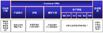 造成這樣的結(jié)果, 關(guān)鍵在于僅僅用產(chǎn)品或服務(wù), 無法表達(dá)出客戶對企業(yè)完整的價(jià)值取向. 我們還需要更豐富的管理理念來表達(dá)出企業(yè)對客戶所有的價(jià)值提供. 這一概念其實(shí)早已由埃森哲提出, 我們稱之為”Customer Offer”. 其內(nèi)涵在國內(nèi)的實(shí)際項(xiàng)目中已經(jīng)得到實(shí)踐的檢驗(yàn), 并取得良好的效果(該項(xiàng)目為某國內(nèi)領(lǐng)先的電信運(yùn)營企業(yè)的CRM項(xiàng)目, 于2003年底完成).