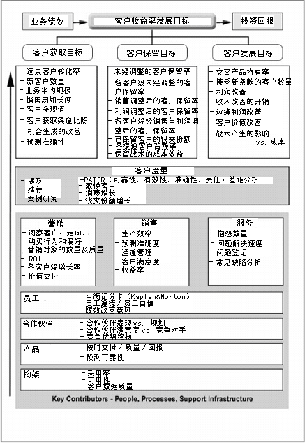 Buttle 教授所著《中端市場CRM》一書中發(fā)現(xiàn)的。它們按縱向排列,最頭上是客戶收益率及發(fā)展目標。下面是對其進行支持的度量方法,此外還提供了一些關(guān)鍵指標用以指示策略是否起作用或需要調(diào)整。當(dāng)然我知道你能投入更多,不過我建議你專注于那些能夠直接影響到CRM遠景與策略的度量方法。如果你發(fā)現(xiàn)以前的度量方式成了障礙,那么就把它們清除掉。