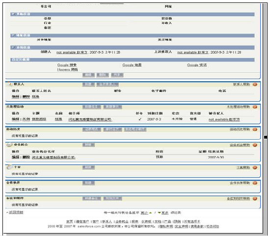 易客CRM客戶維護(hù)界面的內(nèi)容模塊設(shè)計(jì)優(yōu)于Salesforce,相對更適合中國用戶的思維習(xí)慣,但和XToolsCRM相比還有相當(dāng)差距。其模塊構(gòu)成包括: