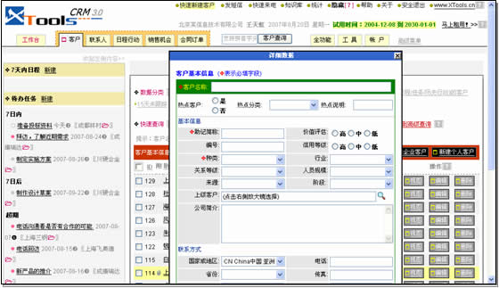 XToolsCRM的快速新建客戶頗有些新意,從操作上看,它突破了關(guān)系型數(shù)據(jù)庫中客戶和聯(lián)系人表分離的制約,同時(shí)保存兩表數(shù)據(jù),很方便。