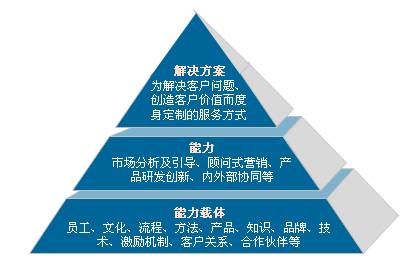 解決方案導(dǎo)向型企業(yè)在整個(gè)經(jīng)營(yíng)過(guò)程中積極倡導(dǎo)上述觀念,并在向客戶(hù)的服務(wù)過(guò)程中身體力行,這需要企業(yè)具備哪些核心的能力,這些能力又該如何獲取呢?看看下圖中的解決方案型企業(yè)能力金字塔: