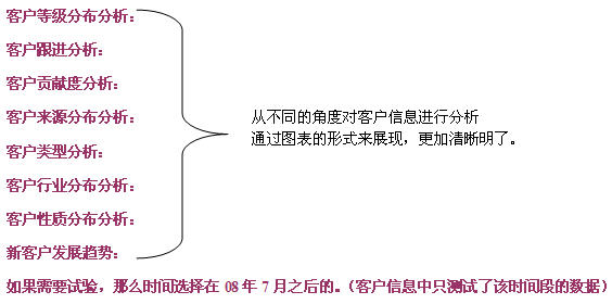 - 客戶分析:根據(jù)客戶管理的進程,多方位多角度的分析客戶的構(gòu)成、發(fā)展、進程、貢獻等,幫助企業(yè)快速響應(yīng)客戶的需求,有價值的關(guān)懷客戶,使企業(yè)客戶關(guān)系管理建立起一套科學的體系。