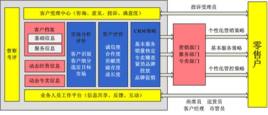 煙草行業(yè)的CRM項(xiàng)目是建立在煙草行業(yè)獨(dú)特的業(yè)務(wù)流程和特點(diǎn)之上的。在煙草行業(yè),CRM系統(tǒng)往往并不是作為一個(gè)獨(dú)立的系統(tǒng)存在,而是要與營(yíng)銷系統(tǒng)、專賣系統(tǒng)等緊密聯(lián)系,形成相互共享資源的一個(gè)整體。因此,煙草行業(yè)CRM業(yè)務(wù)模型(如圖)要根據(jù)企業(yè)的經(jīng)營(yíng)目標(biāo)、任務(wù)、市場(chǎng)管理的工作需要,為營(yíng)銷、服務(wù)和專賣等部門制定營(yíng)銷策略、服務(wù)策略和管控策略。