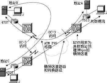 這個例子中,OC-3 ATM連接配置上3 Mbps PVCsL連到不同的遠程位置。RSVP確保QOS從這個PVC通過當?shù)氐木W(wǎng)絡(luò)路由連到正確的使用地。