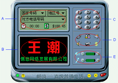 (如圖1)“王潮暢談?wù)Z音全球通”的主界面。A部分是虛擬液晶顯示屏,這里顯示的內(nèi)容與 D(功能鍵區(qū))相對(duì)應(yīng),B是廣告位,如果有興趣可以與王潮公司聯(lián)系作廣告(^_^),C是撥號(hào)區(qū),D是功能按鈕區(qū),集中了這個(gè)軟件的主要功能,E是音量調(diào)節(jié)區(qū)。整個(gè)界面簡潔合理。