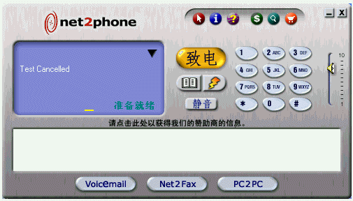 。ㄈ鐖D2),這是 Net2phone的界面,整個(gè)結(jié)構(gòu)一目了然,注意最下面的幾個(gè)按鈕:“voiceemail(語音郵件),net2fax(網(wǎng)絡(luò)傳真),pc2pc(計(jì)算機(jī)之間的通信)”, 這些就是 Net2phone的主要功能了,在上面一行的那個(gè)畫有鼠標(biāo)指針的按鈕是主菜單,里面有軟件最主要的設(shè)置項(xiàng)。