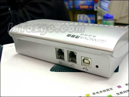 于是俺馬上來(lái)到商家朋友的柜臺(tái),準(zhǔn)備看看究竟是何方“神圣”,能有如此的本事?老板笑呵呵的將產(chǎn)品包裝打開,從里面拿出了一個(gè)銀色的盒子,全塑外殼,材質(zhì)還算不錯(cuò)。個(gè)頭倒也不小,表面積和一個(gè)普通的鼠標(biāo)墊差不多,流線型機(jī)身,這款產(chǎn)品外表設(shè)計(jì)非常簡(jiǎn)單,僅在后部設(shè)有兩個(gè)電話線專用的RJ11口和一個(gè)USB接口,其它就沒(méi)有什么特殊的地方了。