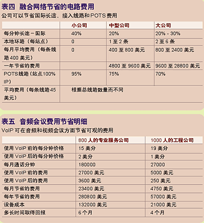 據(jù)研究顯示,當(dāng)公司融合它們的網(wǎng)絡(luò)后,將電信費(fèi)用減少了25%到60%。(見表四)這筆費(fèi)用包括每分鐘長途、本地環(huán)路、普通電話服務(wù)(POTS)線路和音頻/視頻服務(wù)。