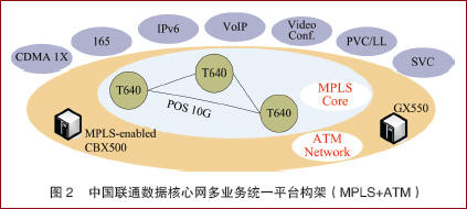 中國聯(lián)通IP電話網(wǎng)的承載網(wǎng)分為核心層和區(qū)域層兩級結構,核心層由北京、上海、廣州、沈陽、武漢、西安和成都7個大區(qū)節(jié)點組成;區(qū)域層按各分公司區(qū)域分布情況,劃分為22個區(qū)域。建網(wǎng)初期,承載網(wǎng)采用ATM+IP/VPN組成IP電話專用傳輸網(wǎng),確保IP承載層的QoS,網(wǎng)絡性能符合聯(lián)通測試指標。下一階段,中國聯(lián)通數(shù)據(jù)核心網(wǎng)的技術演進路線方向如圖2所示。網(wǎng)絡將以MPLS+ATM為核心技術,在7大核心節(jié)點建設功能強大的MPLS核心網(wǎng)絡,同時采用2層MPLS技術,實現(xiàn)與ATM設備的透明連接,從而構建一個多協(xié)議、多業(yè)務同時兼顧IPv4/IPv6發(fā)展的先進網(wǎng)絡。中國聯(lián)通的互聯(lián)網(wǎng)、數(shù)據(jù)專線、IP電話、視頻會議、IPv6網(wǎng)絡、CDMA1X數(shù)據(jù)通信網(wǎng)等都承載在統(tǒng)一的數(shù)據(jù)傳送平臺之上。