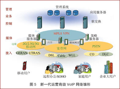 隨著以軟交換和MPLS/VPN兩項技術為核心的下一代網(wǎng)絡技術的不斷成熟和發(fā)展,將構筑起新一代運營商級的VoIP網(wǎng)絡雛形,如圖5所示。