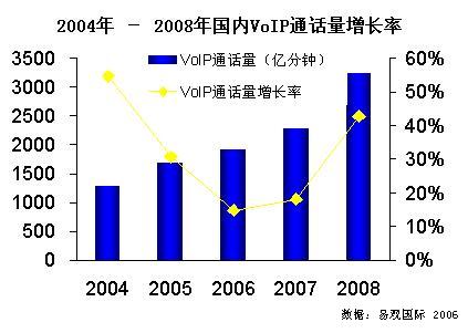 新華美消息:易觀國際《中國 VOIP 市場(chǎng)監(jiān)管政策趨勢(shì)預(yù)測(cè)專題報(bào)告2006》中指出,VoIP 是大勢(shì)所趨,政策壓制的原因是開放的條件不成熟。一切政策的制定都要遵從一個(gè)大前提,即保障公開競爭、維護(hù)國家和用戶利益、防止重復(fù)建設(shè)。2004年-2008年國內(nèi) VoIP 通話量增長率圖下載: