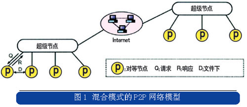 Skype是P2P技術(shù)演進(jìn)到混合模式后的典型應(yīng)用,它結(jié)合了集中式和分布式的特點,在網(wǎng)絡(luò)的邊緣節(jié)點采用集中式的網(wǎng)絡(luò)結(jié)構(gòu),而在超級節(jié)點之間采用分布式的網(wǎng)絡(luò)結(jié)構(gòu),混合模式的P2P網(wǎng)絡(luò)模型如圖1所示。