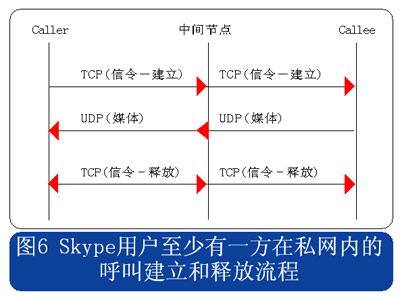 查找到希望連接的用戶后,可以將其加入好友列表,Skype用戶可以隨時與在線的好友進(jìn)行呼叫。經(jīng)過了稍微復(fù)雜的認(rèn)證過程和用戶查找過程,呼叫建立和釋放的過程就變得簡單了。用戶位于公網(wǎng)和位于私網(wǎng)內(nèi)部的情況會有所不同,兩種情況下的呼叫建立和釋放流程分別見圖5和圖6所示。