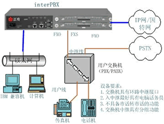 根據(jù)電話交換機(jī)的配置和功能不同,電話交換機(jī)與 interPBX設(shè)備的連接方式有二種常見方式,下面結(jié)合示意圖來具體說明。