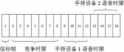 根據(jù)設計的特點,無線語音網(wǎng)關同手持設備間的無線網(wǎng)絡采用星型拓撲結構,無線語音網(wǎng)關作為無線個域網(wǎng)的協(xié)調(diào)器同手持設備進行信息交互。IEEE802.15.4MAC層分為使用信標幀和不使用信標幀兩種工作模式,本設計采用使用信標幀同步的超幀結構,由無線語音網(wǎng)關發(fā)送信標幀同步無線手持設備的數(shù)據(jù)傳輸。本設計中超幀長30ms,等分為16個時隙,每個時隙為1.875ms。信標幀在時隙1發(fā)送,時隙2到時隙8為競爭時隙,使用時隙CSMA-CA算法傳輸命令幀和應答幀。時隙9到時隙16固定分配給兩個手持設備作為上下行語音數(shù)據(jù)通道。上下行各兩個時隙的分配可以滿足經(jīng)