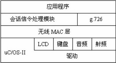 操作系統(tǒng)之上是無線MAC層,該模塊針對語音無線傳輸?shù)奶攸c簡化實現(xiàn)了IEEE 802.15.4 協(xié)議MAC層功能。第三層為語音壓縮編解碼g.726模塊和無線網(wǎng)內(nèi)部會話信令處理模塊。會話信令處理模塊負責處理來自無線語音網(wǎng)關的會話信令。最上層為應用層,實現(xiàn)用戶界面和通話過程控制。無線手持設備總統(tǒng)框架如圖6所示。