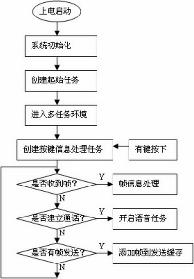 當手持設備上電啟動后,其工作流程如圖7示。首先進行的是系統(tǒng)的初始化,包括處理器初始化,操作系統(tǒng)mC/OS-II初始化,LCD,鍵盤,射頻模塊等的初始化。之后建立起始任務并通過OSStart()函數(shù)進入多任務環(huán)境。此時起始任務占用CPU資源,在起始任務中,建立按鍵信息處理任務并通過信號量機制掛起。然后判斷是否收到來自無線語音網(wǎng)關的幀,如果有,調(diào)用frame_deal()函數(shù)處理幀信息,在該函數(shù)中調(diào)用call_command_deal()完成無線網(wǎng)內(nèi)部會話信令的處理。接著判斷通話是否建立,如果建立則創(chuàng)建語音任務,在語音進程中使能PCM編解碼芯片,并進行g.726壓縮編碼。最后判斷是否有幀需要發(fā)送給無線語音網(wǎng)關,如果有則把幀添加到發(fā)送緩存,等待發(fā)送時隙到來。這一過程完成以后重新跳到判斷是否收到來自無線語音網(wǎng)關的幀,重復以上過程。如果有鍵盤中斷,將會釋放一個信號量,該信號量將解掛按鍵信息處理任務。該任務對鍵盤輸入信息進行處理。