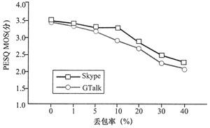 MOS分?jǐn)?shù)比GTalk高,如圖8所示。在丟包率為5%時(shí),Skype添加了過多的冗余,消耗了過多的網(wǎng)絡(luò)帶寬,而PESQ
