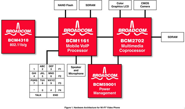該方法的一個例子如圖1所示。該方案支持接入到本地無線網絡的Wi-Fi 接口上的全雙工語音和視頻,它已經有了成功的實現(xiàn)案例,并計劃用于一款新型的消費產品設計。所有高級的呼叫建立和管理、音視頻同步以及應用層都在一片BCM1161 VoIP器件上運行。為實現(xiàn)這些功能采用了一片嵌入式通用ARM926E RISC CPU,還有一片嵌入式DSP用于音視頻編解碼和回波消除。利用一個BCM4318E 802.11b/g Wi-Fi無線網絡接口,BCM1161提供了為實現(xiàn)一個具有成本效益的Wi-Fi手機的語音所需的全部功能。