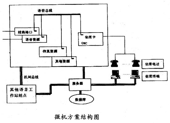 ____這種方案以近幾年發(fā)展迅速的微機(jī)語(yǔ)音處理技術(shù)為基礎(chǔ),其基本思想是在微機(jī)平臺(tái)上 集成各種功能的語(yǔ)音處理卡,完成通信接口、語(yǔ)音處理、傳真處理、坐席轉(zhuǎn)接等功能,再 結(jié)合外部的計(jì)算機(jī)網(wǎng)絡(luò)實(shí)現(xiàn)各種應(yīng)用系統(tǒng)的需求。