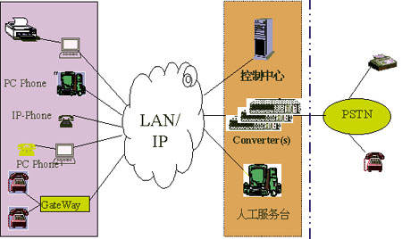 如圖點劃線左邊所示,IP PBX系統(tǒng)通過在網(wǎng)絡(luò)中加入控制中心并利用原有網(wǎng)絡(luò)的結(jié)點(多媒體配置),將LAN改造為PBX電話網(wǎng)絡(luò)。IP