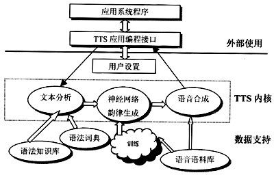 系統(tǒng)的構(gòu)成分為用戶編程接口和TTS內(nèi)核兩大部分。其中,內(nèi)核部分又可按照系統(tǒng)運(yùn)作的不同過程分為多個子模塊,包含了訓(xùn)練模塊、文本分析模塊、神經(jīng)網(wǎng)絡(luò)韻律生成模塊、語音合成模塊以及與語料庫之間的通信協(xié)議等。同時,系統(tǒng)還考慮了不同類型用戶對TTS系統(tǒng)功能的需要,提供了豐富的編程接口。