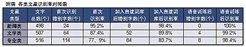 然后,我們又利用聲龍?zhí)赜械脑~匯生成器,讓聲龍自行辨別文章中的詞匯并自動(dòng)添加到自建詞庫中,并針對其中的一些英文單詞或縮寫對聲龍進(jìn)行語音識(shí)別訓(xùn)練,之后我們再次錄入同一篇專業(yè)文章。結(jié)果非常令人滿意,從附表可以看出識(shí)別率有了明顯提高。最后,我們又錄入了另一篇相同領(lǐng)域的專業(yè)文章中的一段(512字)。首次錄入的錯(cuò)別字有46個(gè),識(shí)別正確率為91%。與第一篇文章相比,識(shí)別率有了明顯提高。
